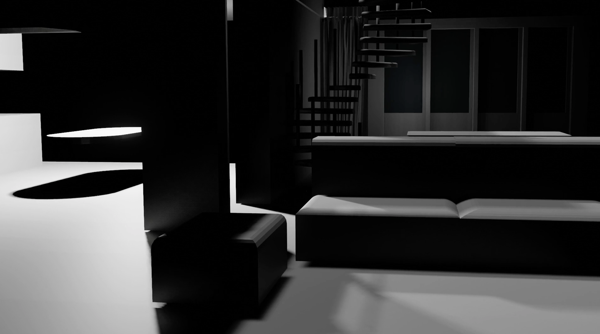 Le regardeur navigue dans cette modélisation sommaire, dans cet espace morcelé, à la rencontre d’une table sans pieds, de murs mouvants ou absents, de formes simplifiées, sans couleurs ni textures. Alors que la maison est vide, les extraits sonores tirés de films de famille semblent lui redonner vie. La spatialisation binaurale semble habiter la maison de ses souvenirs.
